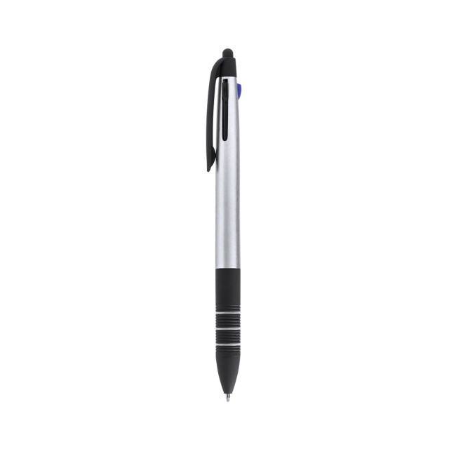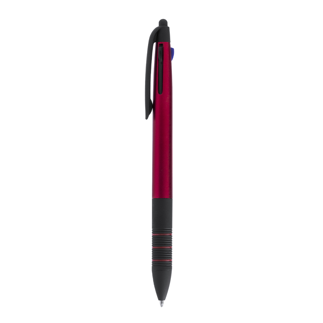 Penna touch 3 in 1 con meccanismo a pulsante rettrattile dal design moderno con fusto liscio e finitura metallica in colori vivaci. Con accessori neri e impugnatura ergonomica nera morbida con anelli coordinati. Con 3 cartucce di inchiostro blu, rosso e nero.