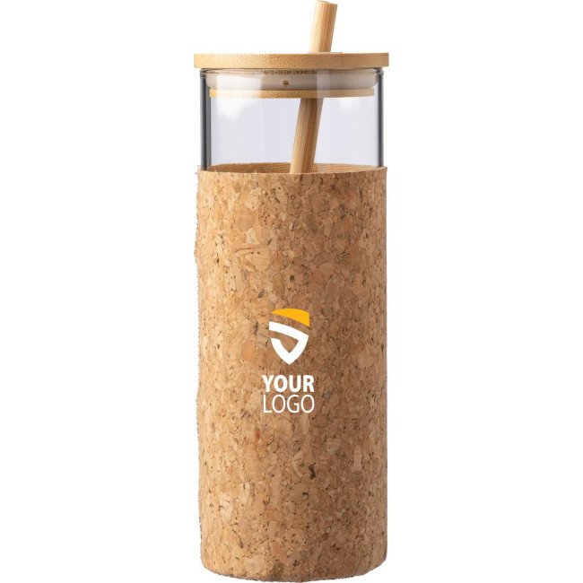 Bicchiere in vetro borosilicato, singola parete, custodia in sughero, tappo e cannuccia in bambù, adatto per bevande calde e fredde, confezionato singolarmente in una scatola in cartone avana, capacità 450 ml