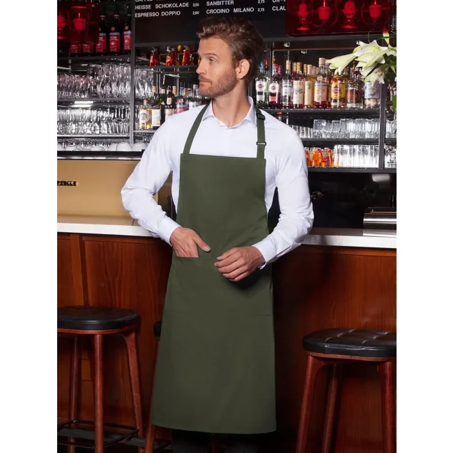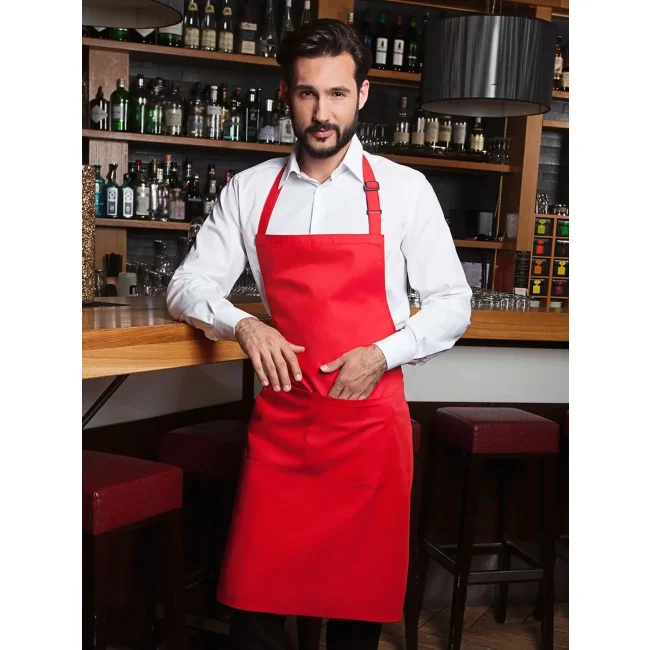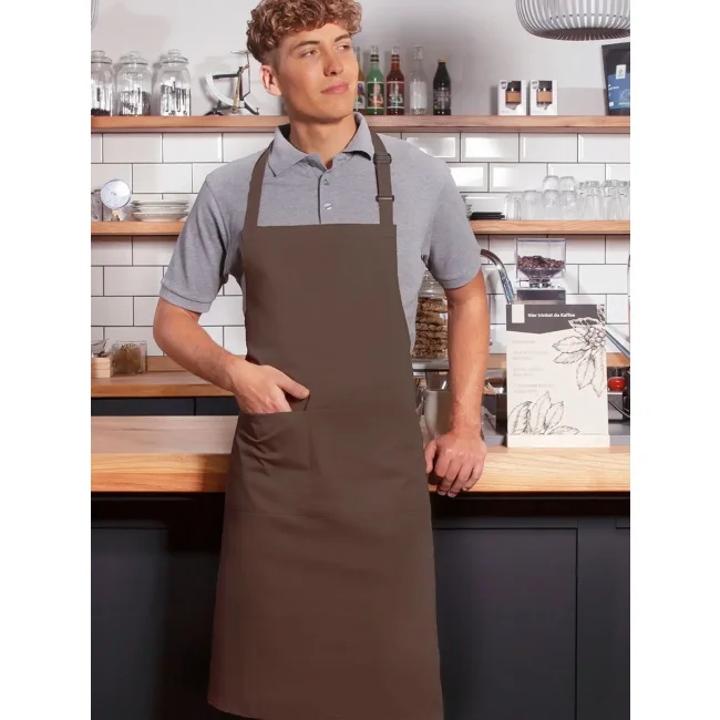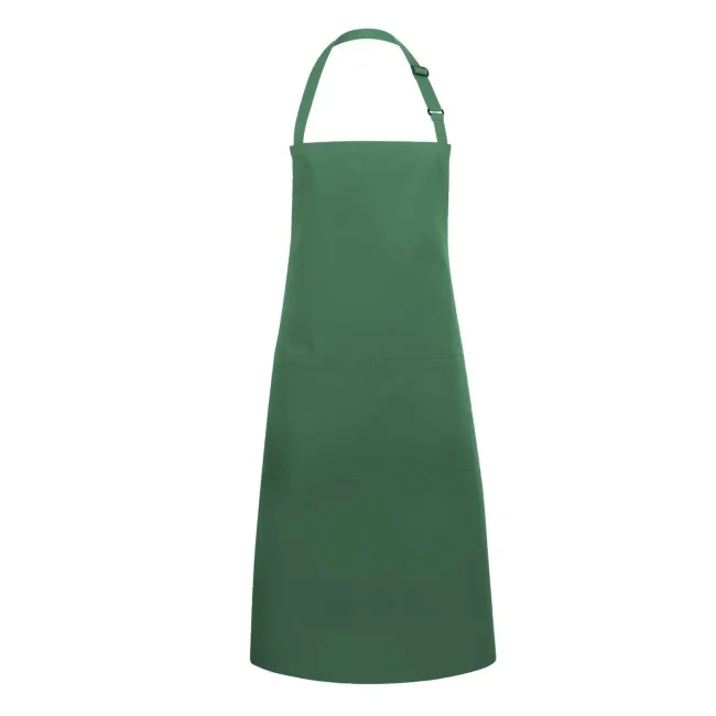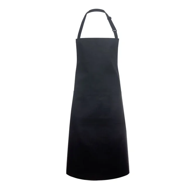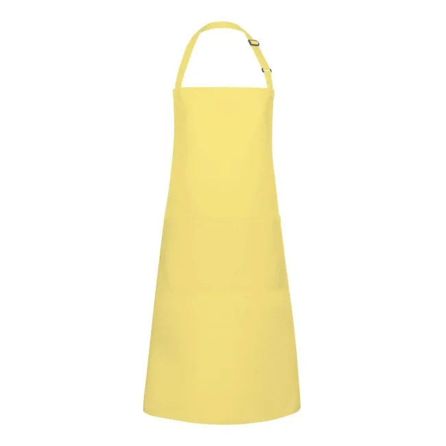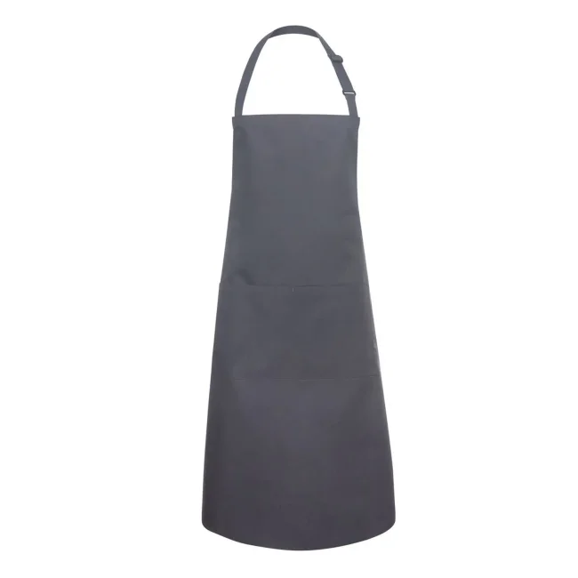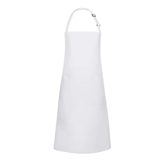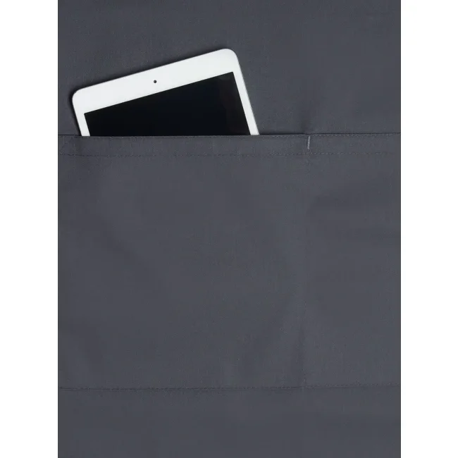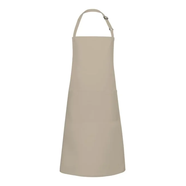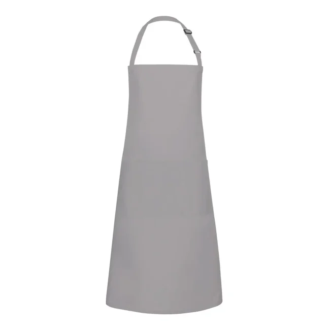 65% poliestere, 35% cotone. Grembiule con pettorina e lacci dello stesso tessuto, cucitura rinforzata, laccio della pettorina con fibbia per regolazione continua della lunghezza fino a 70 cm, tasca applicata con 2 scomparti (40 x 20 cm) Misura 75x90cm.