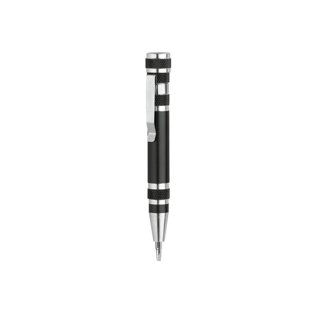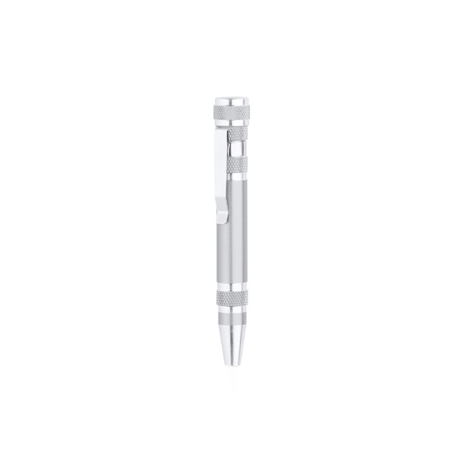 Multiutensile in alluminio con 6 accessori in una gamma di colori metallizzati brillanti. Con corpo antiscivolo e clip in metallo. Include 6 teste di cacciaviti piatti e a croce.
