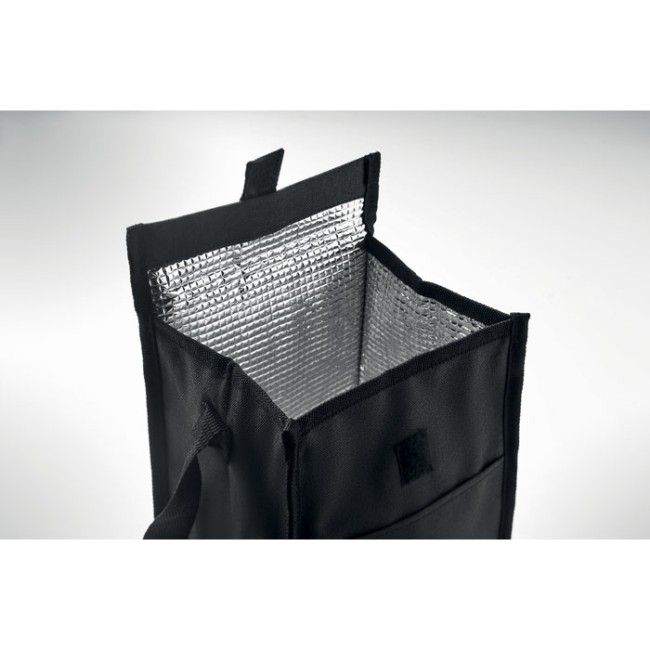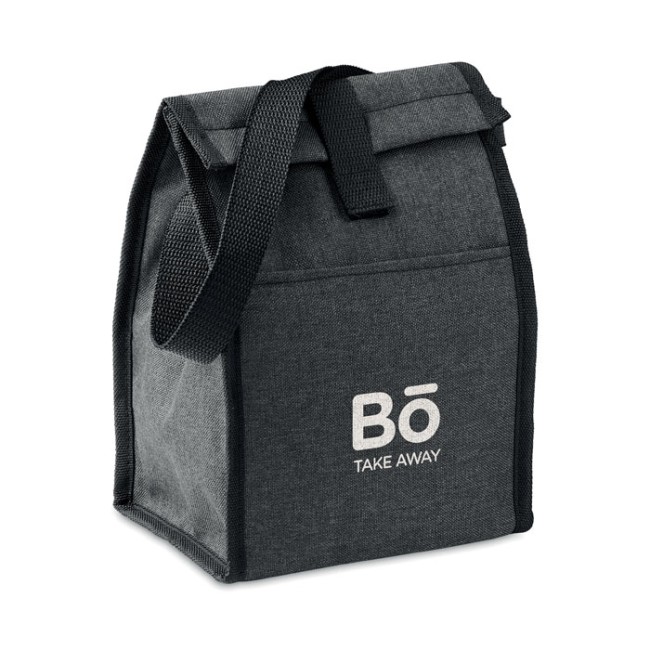 Borsa da pranzo isolata in RPET 600D con tasca frontale. Mantenete il vostro cibo e le vostre bevande fresche con la borsa realizzata in plastica PET riciclata. Portate un sano pranzo fatto in casa al lavoro o ad un picnic. Con una capacità di 3L potete conservare un pasto completo. Materiale isolante: 2 mm di schiuma PE con foglio di alluminio.