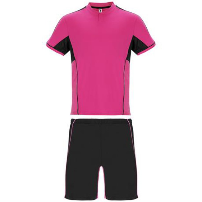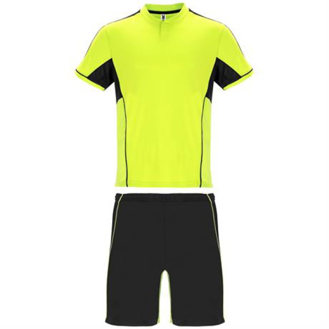 Completo sportivo unisex con combinazione di tre tessuti, maglietta con collo alla coreana e apertura con bottone a pressione, interno della manica in tessuto traspirante e pannelli laterali. Pantaloncino con vita regolabile e coulisse. Interno della gamba e bordi a contrasto in tessuto.