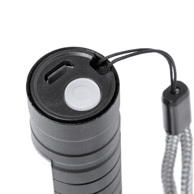 Potente torcia con batteria ricaricabile, realizzata in alluminio con finitura nera. Luce frontale con 1 LED e testa regolabile, per avere una messa a fuoco più mirata o aperta. Inoltre, dispone di 10 luci COB nell'impugnatura e di tre modalità di illuminazione (fissa e lampeggiante a due velocità), include una cinghia di trasporto. Alimentato da una batteria ricaricabile da 400 mAh, include un cavo micro USB. Confezionato singolarmente in una scatola di design.