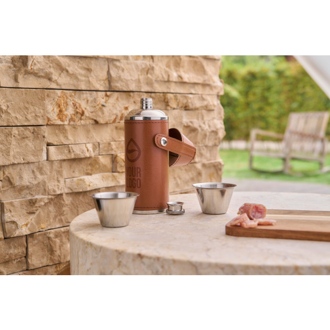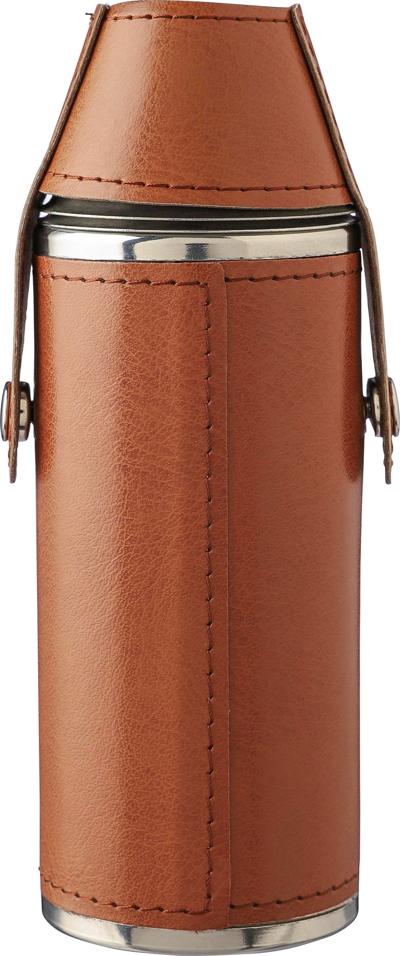 Borraccia in acciaio inox 304 riciclato, include presa esterna in PU, due tazze (40 ml) fissate in alto tramite pulsanti, confezionata singolarmente in una scatola in cartone avana, capacità 230 ml