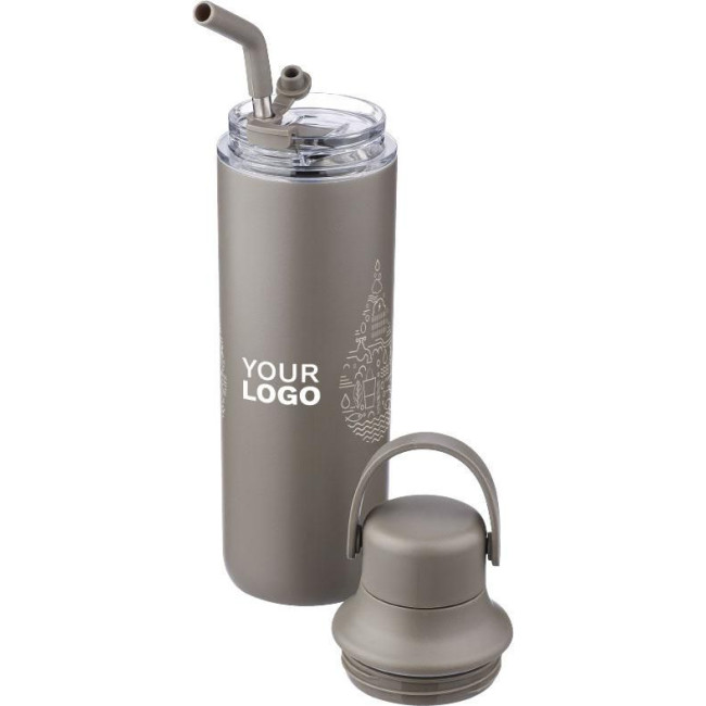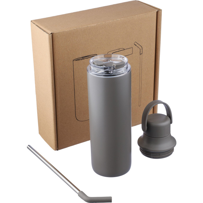 Borraccia in acciaio inox riciclato a doppia parete, con interno in acciaio inox 304 ed esterno in acciaio inox 201. Fornita con due tappi: un coperchio in PP con manica per il trasporto, ed uno in PS trasparente da utilizzare con la cannuccia in acciaio inox inclusa, con punta e supporto in silicone, capacità 500 ml, confezionata singolarmente in una scatola di cartone avana.