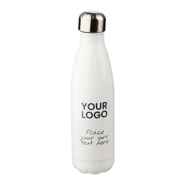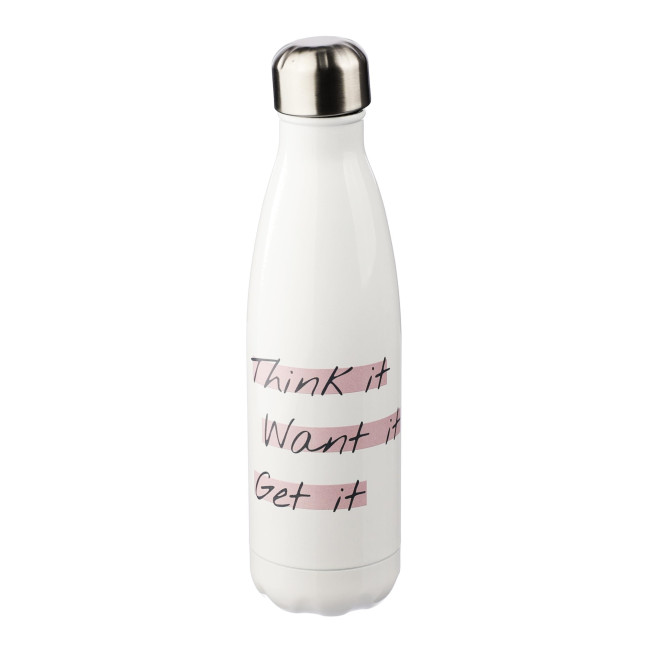 Borraccia in acciaio inox a doppia parete, tappo a vite, capacità 500 ml. A temperatura ambiente mantiene approssimativamente il liquido 6 ore freddo e 4 ore caldo.