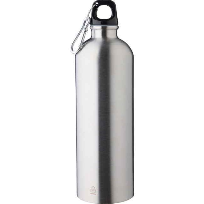 Borraccia in acciaio inox 304 riciclato a parete singola, coperchio in PP e moschettone in alluminio argentato. Presenta un logo inciso riciclato sulla parte anteriore. Capacità 750 ml.
