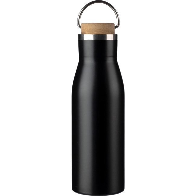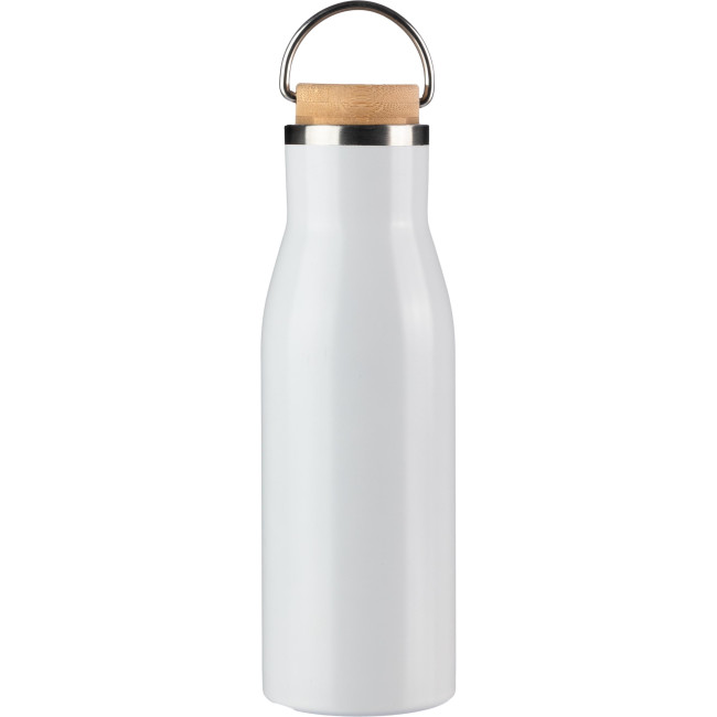 Borraccia in acciaio inox riciclato, doppia parete, appo a vite in bambù, anello per il trasporto, interno in acciaio inox 304 ed esterno in acciaio inox 201, include il logo “acciaio inox riciclato” sulla borraccia, confezionata singolarmente in una scatola in cartone avana, capacità 500 ml