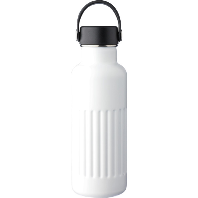 Borraccia in acciaio inox riciclato a doppia parete, con interno in acciaio inox 304 ed esterno in acciaio inox 201, design ad impugnatura a coste. Dotata di un tappo in PP e ferro con manico in TPE per un facile trasporto, include inciso sulla parte frontale il logo “acciaio inox riciclato”, capacità 500 ml, confezionata singolarmente in una scatola di cartone avana.