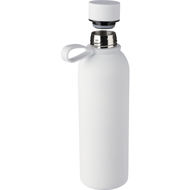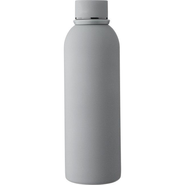 Borraccia in acciaio inox riciclato con isolamento sottovuoto a doppia parete. L'interno è realizzato in acciaio inox 304, mentre l'esterno in acciaio inox 201. Rifinita con un rivestimento gommato per una sensazione di morbidezza al tatto. Coperchio a vite in PP con dettagli in metallo e passante in silicone per il trasporto. La borraccia presenta il logo "acciaio inox riciclato" inciso, capacità 500 ml, confezionata singolarmente in una scatola in cartone avana.