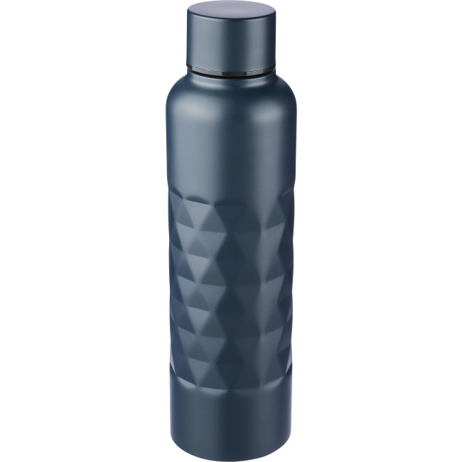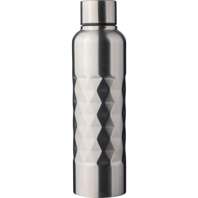 Borraccia in acciaio inox 304 riciclato a singola parete con corpo decorato da una texture a forma di diamante e tappo a vite. La borraccia presenta il logo “acciaio inox riciclato” inciso, capacità 800 ml, confezionata singolarmente in una scatola in cartone avana.