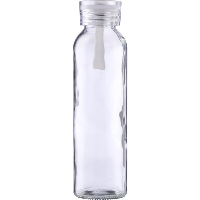 Borraccia in vetro, tappo colorato in PS trasparente, cinturino in silicone in tinta, confezionata singolarmente in una scatola in cartone avana, capacità 500 ml