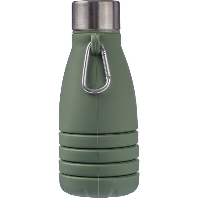 Borraccia pieghevole in silicone, coperchio in acciaio inox e gancio a moschettone in alluminio, dimensioni da ripiegata: ø7x17 cm, dimensioni aperte: ø7x25 cm, confezionamento sfuso, capacità 550 ml