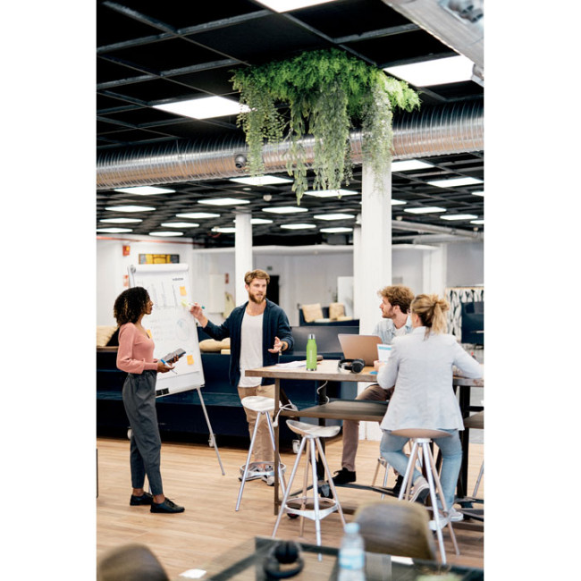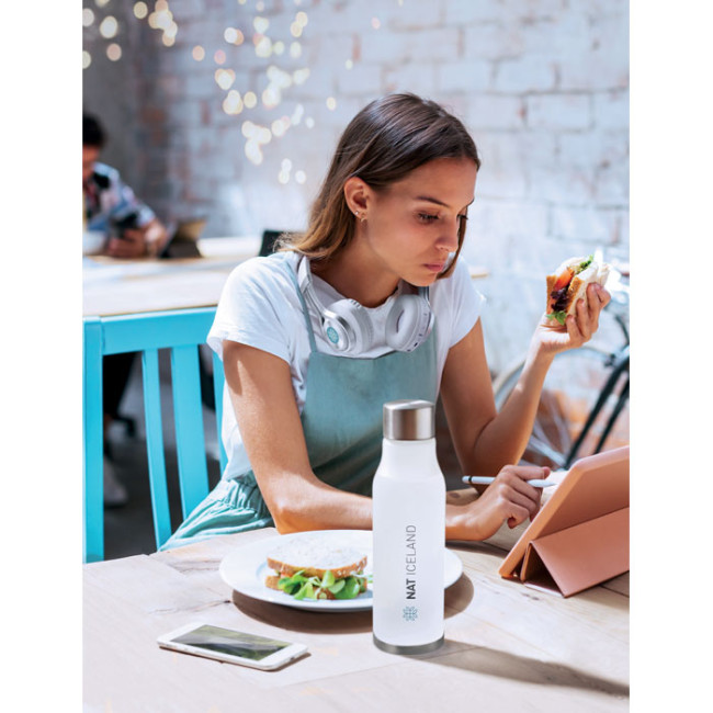 Bottiglia in RPET con finitura gommata e anello in silicone, progettata per un utilizzo pratico e sicuro. Con una capacità di 600 ml, è BPA free e anti goccia, rendendola ideale per il trasporto di liquidi. Non adatta a bevande gassate, alcoliche e a base di latte.