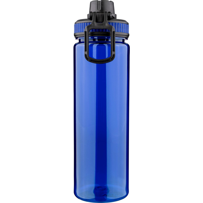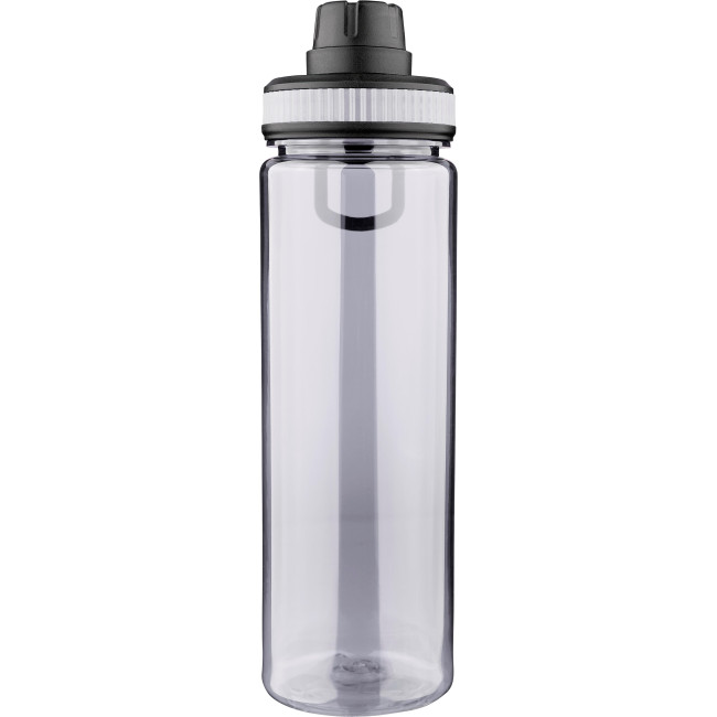 Borraccia in rPET, coperchio in PP con passante per il trasporto e chiusura a vite, include dettaglio in silicone colorato sul tappo, coordinato al corpo trasparente, capacità 750 ml.
