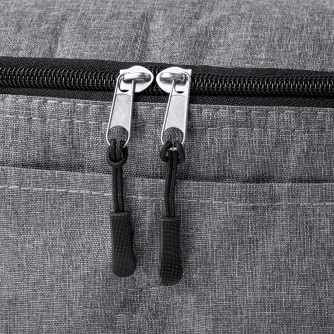 Borsa termica realizzata in resistente poliestere 600D RPET, caratterizzata da un attraente effetto melange. Lo scomparto principale è dotato di chiusura a zip e fodera in alluminio. Include una pratica tasca esterna e una tracolla regolabile, evidenziando il logo RPET sull'etichetta esterna. Confezionata singolarmente in un sacchetto riciclato, il materiale RPET è realizzato con plastica riciclata, contribuendo alla sostenibilità del pianeta.
