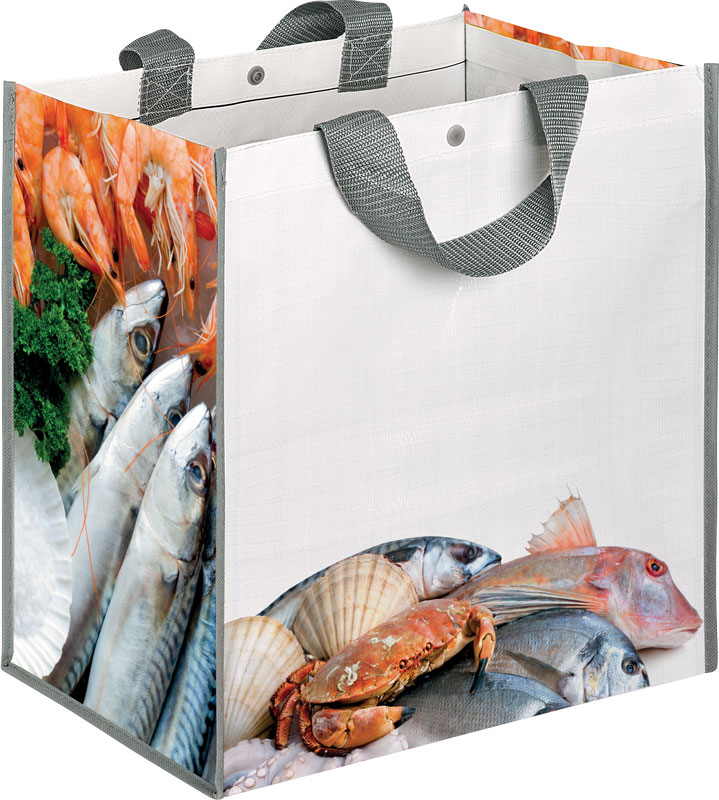 Borsa shopping con soffietto, chiusura con bottone e doppi manici in nylon grigi. Soggetto pesci.