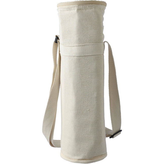 Borsa termica per bottiglie in cotone 270 g/m2 riciclato, rivestimento interno in EPE da 2 mm e PEVA 12C, chiusura lampo, lunga tracolla regolabile, capacità bottiglia da 1,5 litri, include etichetta esterna cotone riciclato