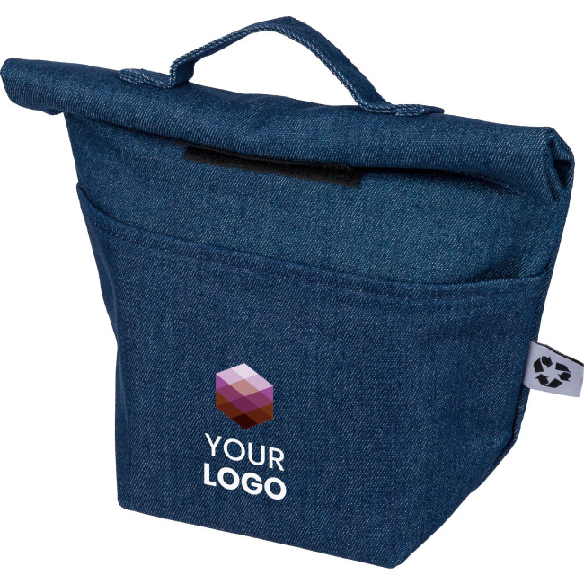 Borsa termica in denim riciclato con chiusura rolltop, dimensioni 27 x 10 x 31 cm, chiusura in velcro, interno in PEVA, manico corto per il trasporto, tasca frontale ed etichetta materiale "riciclato" esterna.