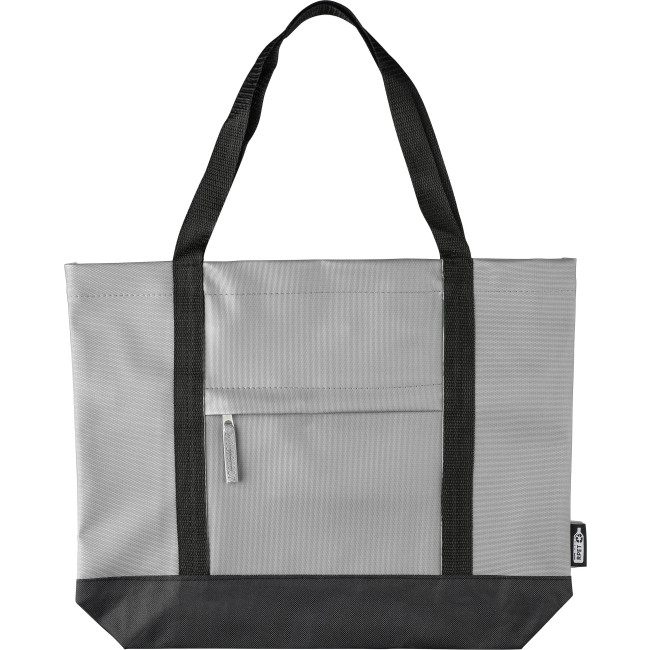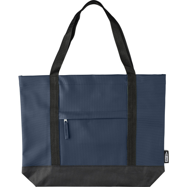 Borsa tote in poliestere 600D rPET, con rivestimento idrorepellente in PU su entrambi i lati. Dotata di scomparto frontale con chiusura lampo, piccola tasca interna con cerniera e manici lunghi per un trasporto comodo. Capacità: 10 litri | Portata: 10 kg. Include un’etichetta rPET.