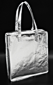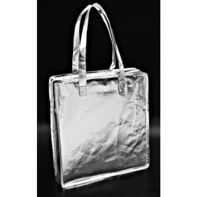 Borsa laminata a soffietto in tessuto non tessuto, chiusura a zip, manici, cucitura perimetrale, colore silver. Misura manici 2x38.