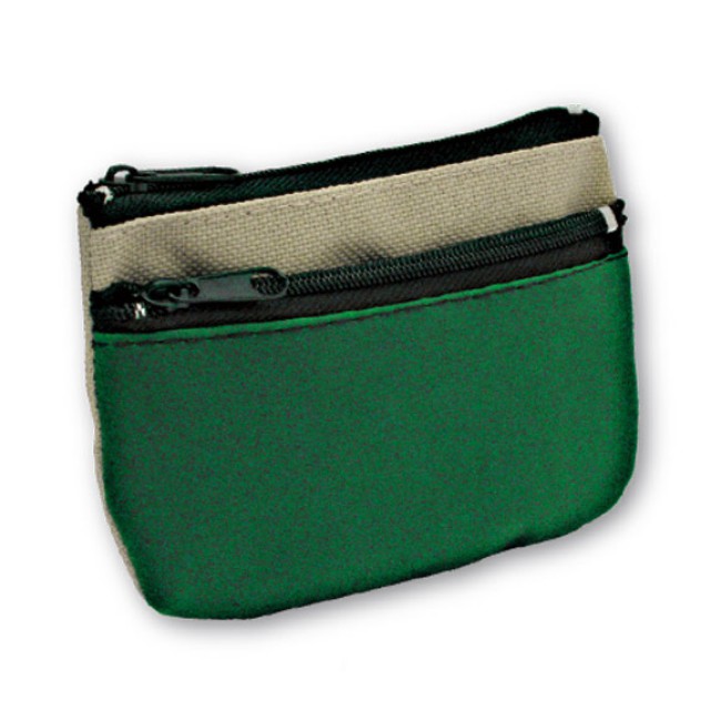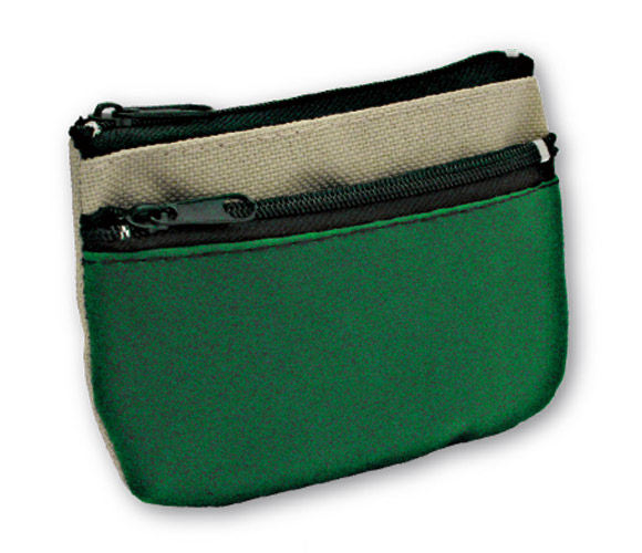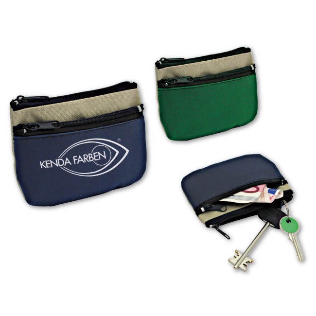Borsellino in 600D e Pu con doppia zipper f.to 11x7,5, zipper piccola f.to 11x6, completo di anello portachiavi.