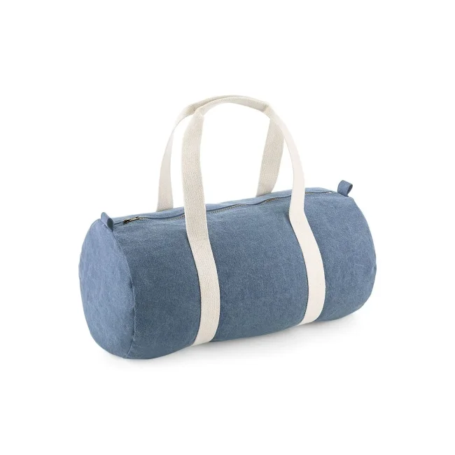 Borsone Denim Barrel Bag realizzato in una miscela di cotone e poliestere, presenta uno scomparto principale con chiusura a zip e manici in cotone, permettendo di portarlo sia a mano che in spalla. Con dimensioni di 25x50x25 cm e una capacità di 12 litri, è pratico per il trasporto di oggetti. Include un'area stampabile di 13x12 cm per personalizzazioni.