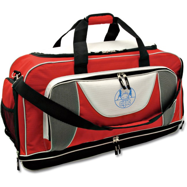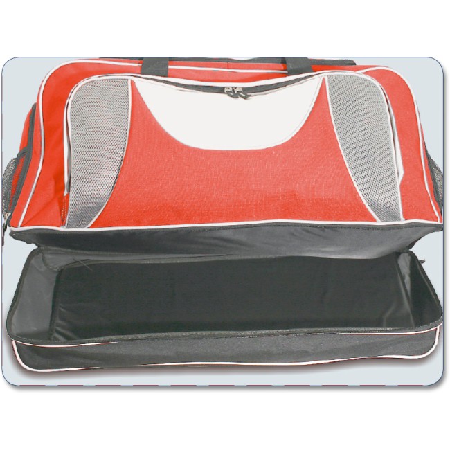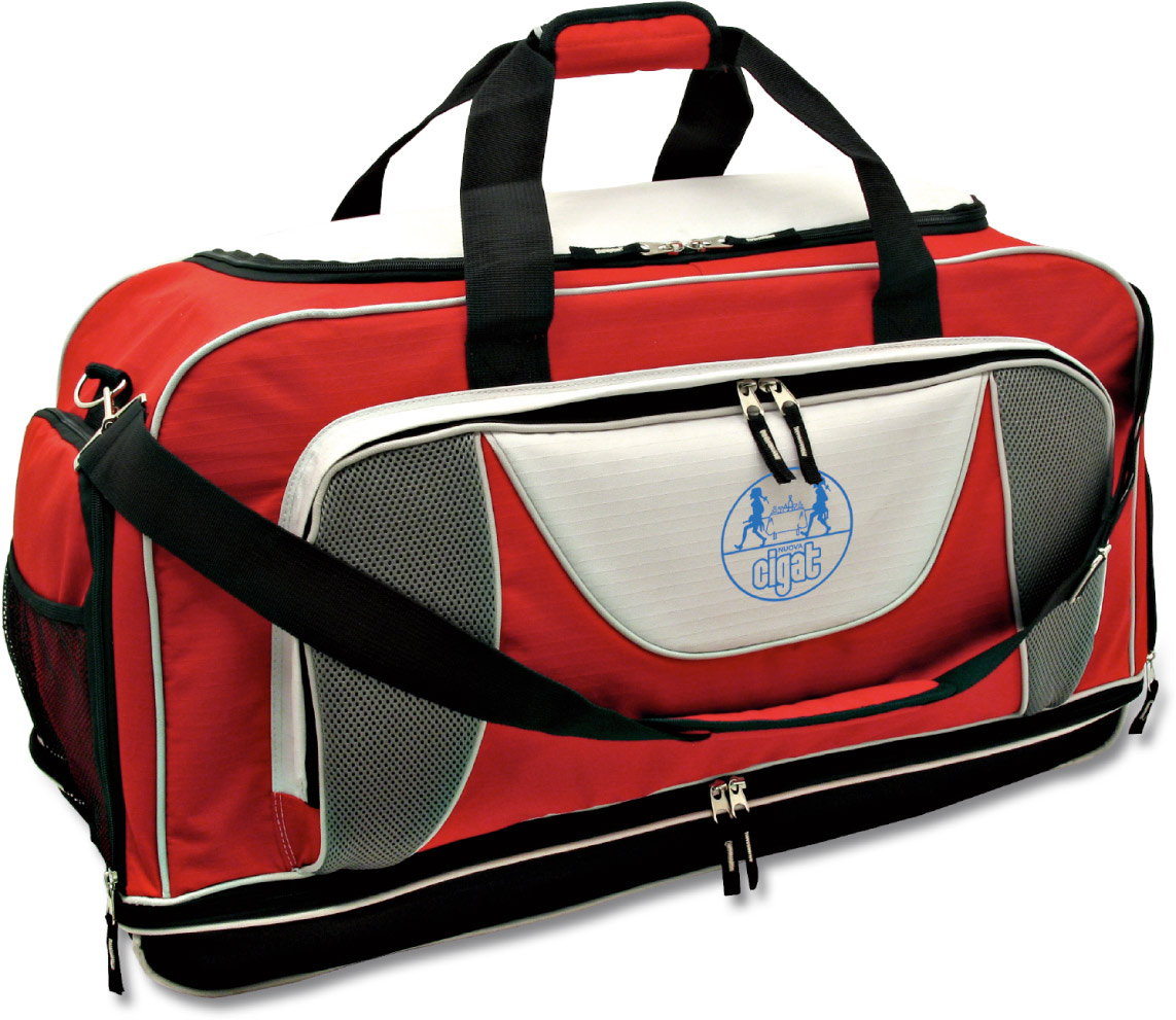 Borsone sportivo in 300d ribstop bicolore grigio e rosso due tasche laterali e tascone sul fondo