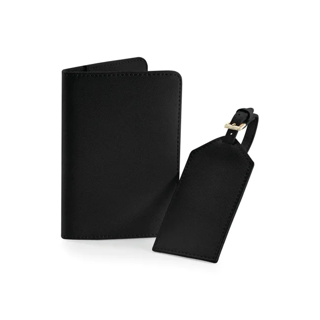 100% ecopelle. Set da viaggio composto da custodia per passaporto e porta-etichetta, rifiniture in metallo dorato, etichetta removibile. Dimensioni porta-passaporto: 10.5x14.5 cm, tag: 6x11,5 cm. Area stampabile porta-passaporto: 8 x 11 cm, tag: 5 x 8 cm.