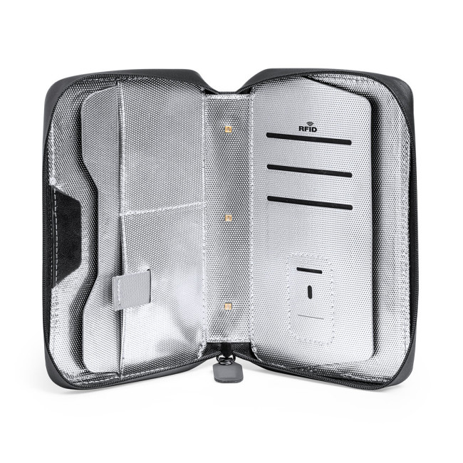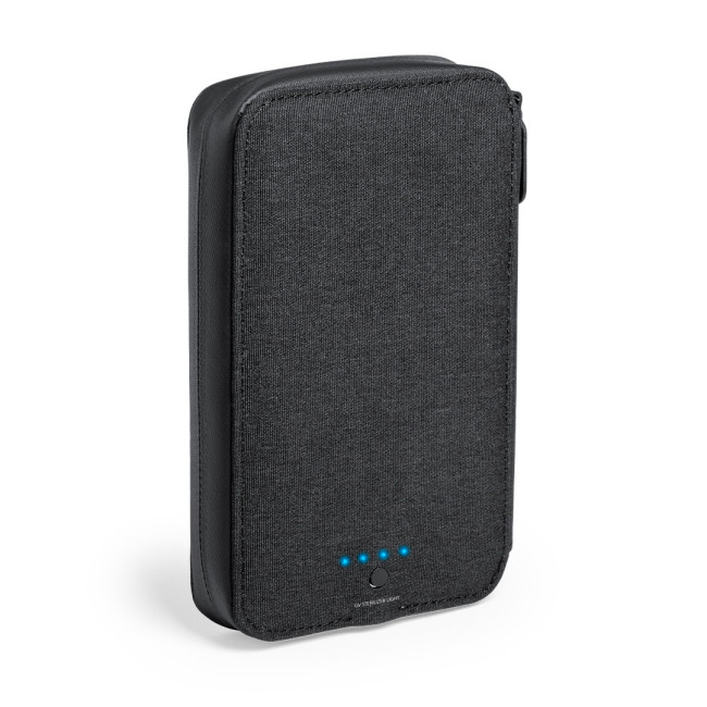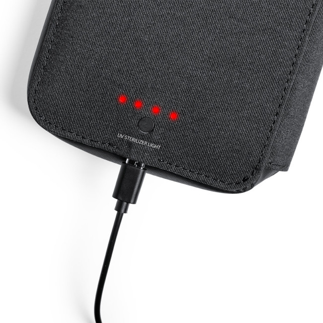 Organizer e sterilizzatore a luce ultravioletta tipo C, con protezione RFID (Radio Frequency Identification) che mantiene al sicuro i tuoi dispositivi di trasmissione dell'identità. Appositamente progettato per l'eliminazione di microrganismi e batteri negli smartphone e altri oggetti di uso quotidiano. Realizzato in resistente Poliestere 600D con finitura denim, con chiusura magnetica di sicurezza sul manico per un utilizzo sicuro del dispositivo. Include 4 porta carte interni + tasca esterna. Presentato in una scatola dal design personalizzato.Potenza LED da 1,2 W e lunghezza d'onda di 275 nm.Tempo di sterilizzazione con funzione di autospegnimento di 1 e 3 minuti.Manuale utente disponibile in spagnolo e inglese.Disponibili certificazioni CE, RoHS e efficacia germicida.Per un corretto utilizzo del prodotto, evitare il contatto con la pelle e gli occhi.