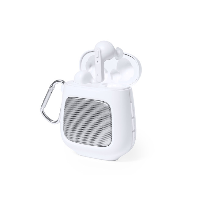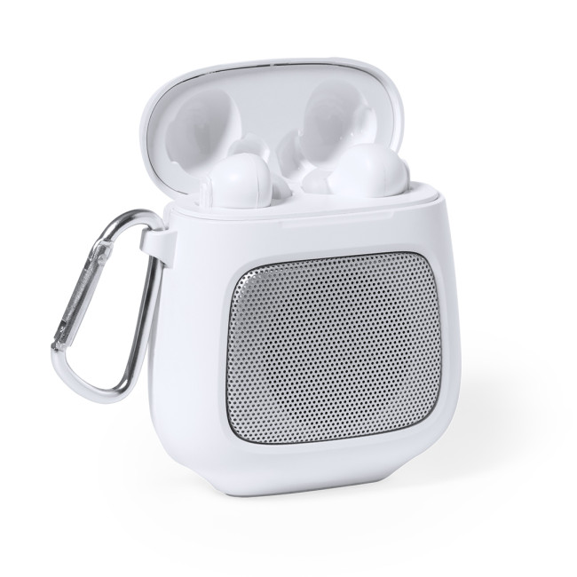 Originali auricolari vivavoce con connessione Bluetooth® 5.0 e realizzate in resistente ABS di colore bianco. Il set comprende un vivavoce Bluetooth® con potenza di 3W, funzione vivavoce e moschettone. È completato da un paio di cuffie in-ear con pulsante di controllo integrato e batteria da 30 mAh ciascuna. Base di ricarica da 600 mAh, con luce di stato a LED. Confezionato singolarmente in una scatola kraft, con manuale di istruzioni in inglese e spagnolo.Prodotto secondo gli standard RoHS e in conformità ai seguenti requisiti di sicurezza:Sistema di protezione dal surriscaldamento.Sistema di protezione dal sovraccarico.Sistema di blocco per evitare cortocircuiti
