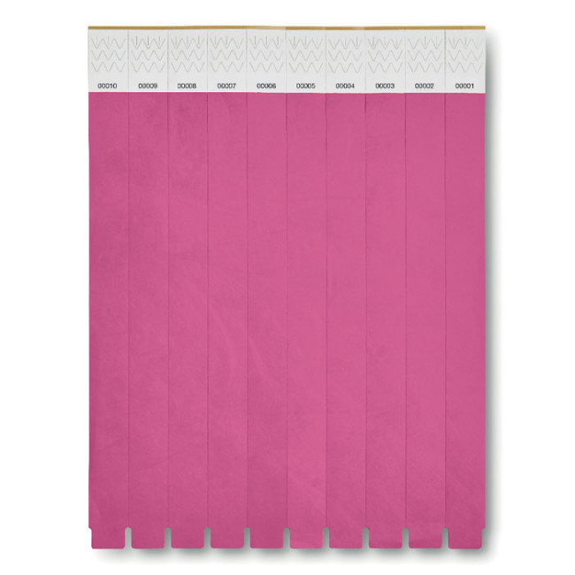 Braccialetto Tyvek® progettato per eventi, disponibile in un foglio da 10 pezzi. Ogni braccialetto ha una larghezza di 19mm e presenta un numero unico per garantire la sicurezza. Prodotto in UE, è resistente e ideale per un uso intensivo.