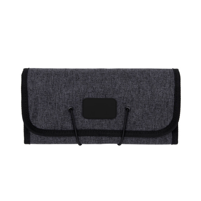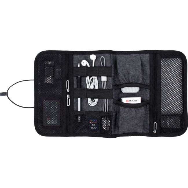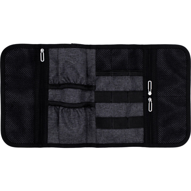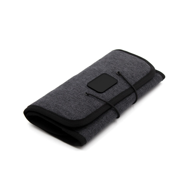 La custodia da viaggio Folio è realizzata in poliestere 600D, idrorepellente e antimacchia, perfetta per tenere organizzati dispositivi digitali e accessori. Presenta 6 anelli elastici per cavi e utensili, 3 tasche a rete per piccoli oggetti e 2 vani per caricabatterie e adattatori. Il design compatto consente di riporla facilmente in borse o trolley.
