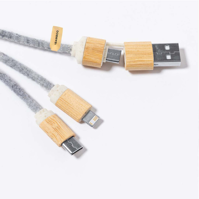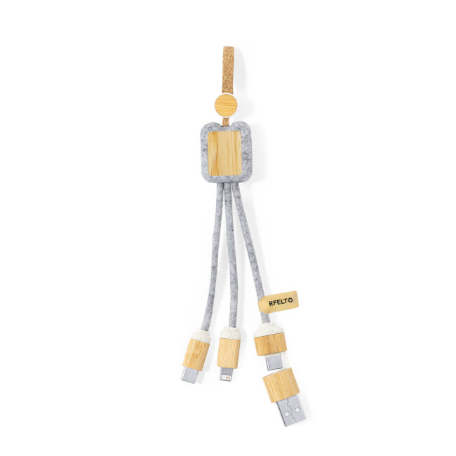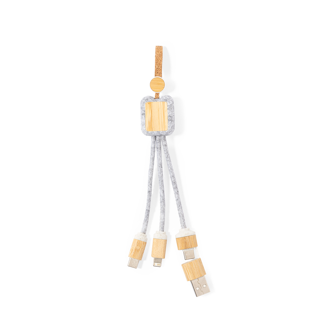 Cavo di ricarica realizzato in bambù e feltro RPET. Con connessioni di ingresso di tipo C e USB e uscite di tipo C, lightning e Micro USB. 5V DC 2,4A. Presentato in un sacchetto kraft individuale richiudibile con etichetta. Il feltro RPET riciclato è il risultato della combinazione del processo di riciclo delle materie plastiche con la tecnica millenaria di produzione del feltro, dando vita a un materiale di eco-tendenza che, oltre a essere di origine riciclata, diventa anche riciclabile.