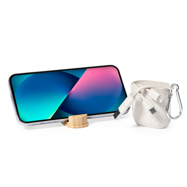 Cavo di ricarica in fibra di grano. Con connessioni di ingresso Type-C e USB e uscite Type-C, Lightning e Micro USB. 5V DC 2,4A. Presentato in una custodia dal design elegante in fibra di grano con coperchio in bambù e funzione di supporto per smartphone. Realizzato con elementi di origine vegetale per promuovere l'uso di materie prime naturali e ridurre le emissioni inquinanti.