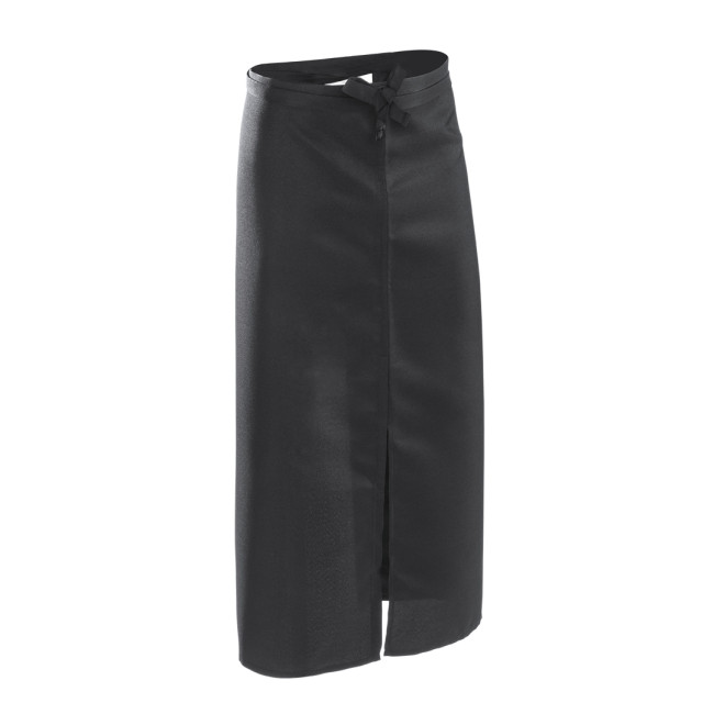 Grembiule a vita realizzato in poliestere resistente in un elegante colore nero. Taglio sotto il ginocchio e cinghie di regolazione.