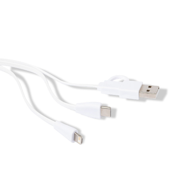 Cavo di ricarica con portachiavi, realizzato in bambù con estratto di marmo. Include connessioni di ingresso USB e Type-C, con uscite Lightning, Micro USB e Type-C 5VDC 2,4A. Confezionato in un sacchetto kraft individuale.