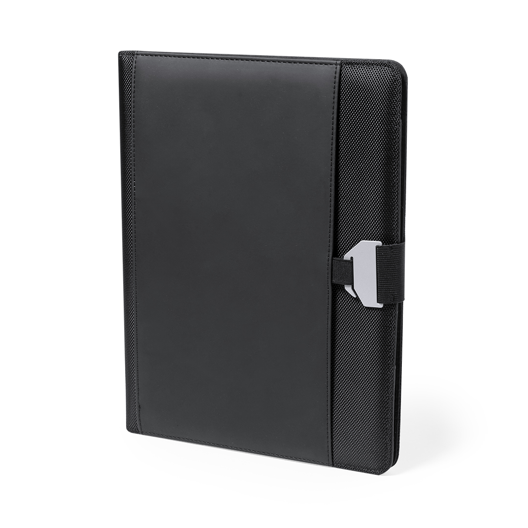 Cartella tecnologica in elegante combinazione di poliestere e morbida similpelle con originale chiusura in metallo. Interno con vari scomparti per riporre chiavetta USB, powerbank, scomparto a sfioramento per smartphone, portacarte e portapenne. Con block notes rimovibile di 20 pagine a righe e presentato in un'elegante scatola nera.