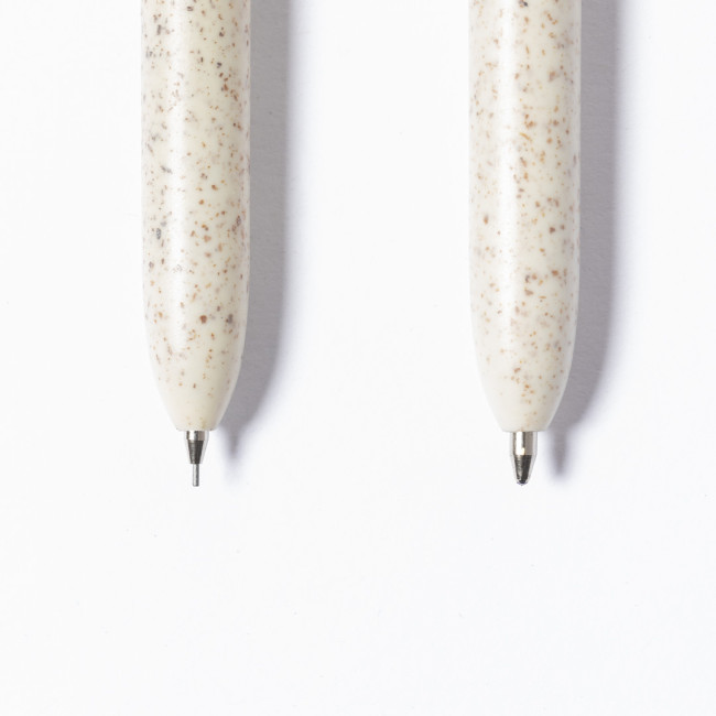 Set di penna e portamine della linea natura. Realizzato con una combinazione di fibra di grano e clip di bambù per promuovere l'uso di materie prime naturali e ridurre le emissioni inquinanti. Clip con ampia area di stampa. Penna con refill blue e portamine con 2 mine da 0,5 mm incluse. Confezionato in una scatola individuale di cartone riciclato con il logo Wheat Straw sulla parte superiore della penna e della matita.