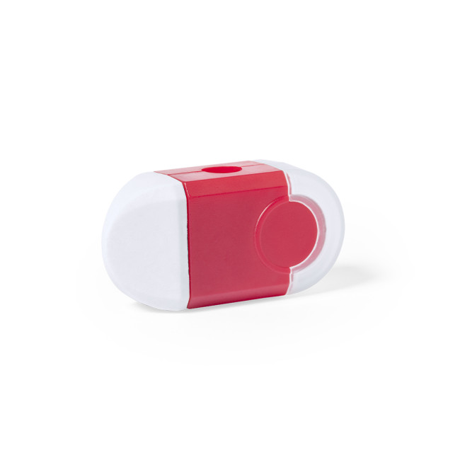 Set di gomme e temperamatite in colori vivaci. Vano rifiuti con cappuccio trasparente
