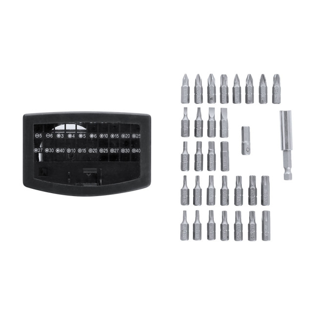 Set di attrezzi pratico con custodia in ABS. Include un adattatore di precisione con 32 accessori magnetici, composti da varie punte: philips, star, flat, esagonale e torx.
