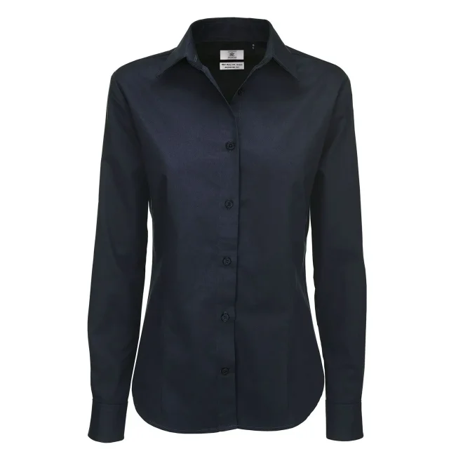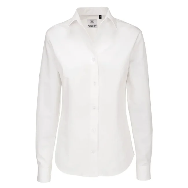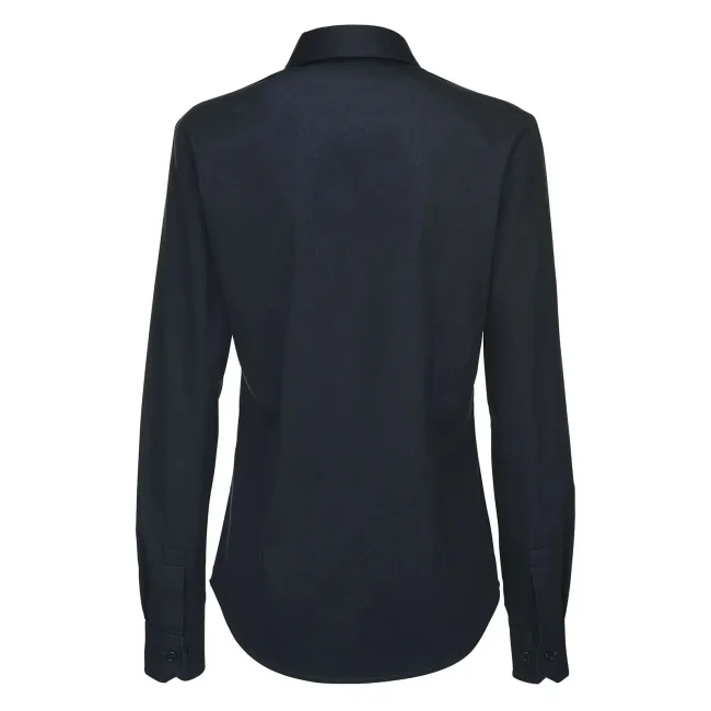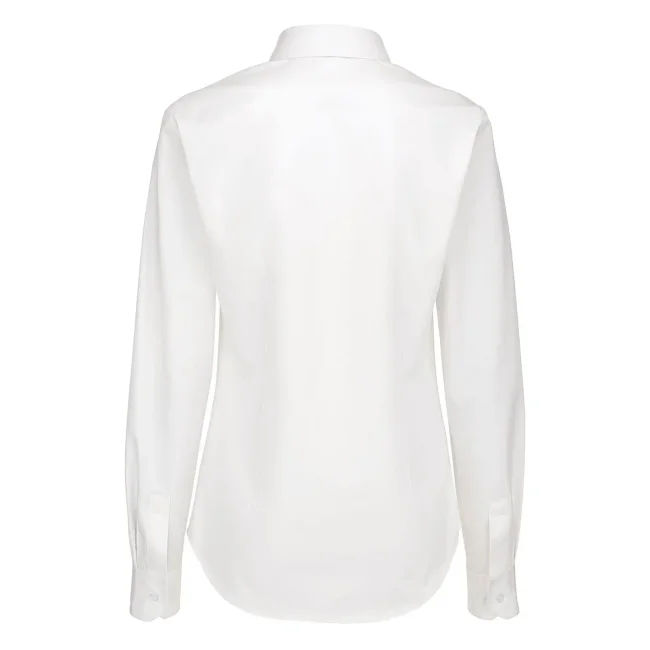 Camicia donna realizzata in 100% cotone pettinato, caratterizzata da un polsino squadrato con due bottoni e un taglio leggermente sfiancato. Presenta bottoni cuciti a croce con effetto madreperla e un'asola orizzontale per l'ultimo bottone. Include un bottone di riserva per eventuali sostituzioni.