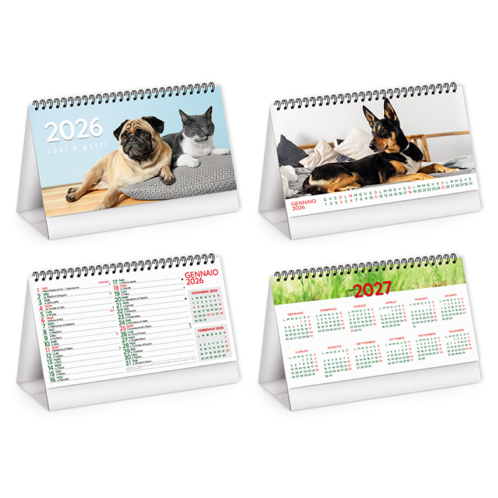 calendarietto spiralato da tavolo illustrato mensile 13 fogli carta patinata 90gr tabella anno 2026 in ultima pagina festività internazionali supporto cartoncino bianco tecnica di stampa consigliata: adesivo digitale - serigrafica