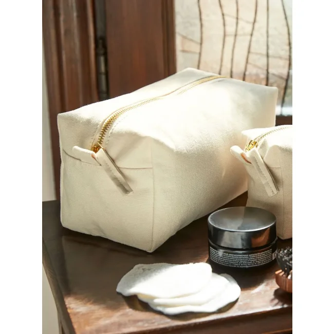 100% cotone Canvas pettinato. Astuccio multiuso, chiusura con zip, etichetta removibile. Dimensioni: S: 17x9x7cm, cap. 1,5lt. - L: 21x11x11cm cap. 3lt.
