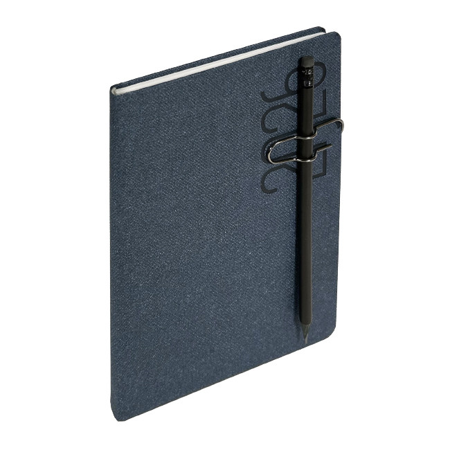 Grafica interna blu,grigio. Copertina in cartoncino riciclato rivestito di Napura Canvas, carta tinta in pasta certificata FSC goffrata effetto tessuto con elastico, angoli arrotondati e stampa a secco.