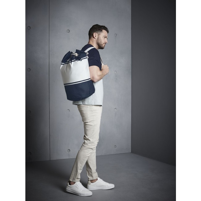 100% cotone Canvas. Sacca stile nautica adatta alla spiaggia, chiusura con cordoncino. Etichetta removibile. Dimensioni: 30 x 53 x 30 cm, capacita': 30 litri, area stampabile: 41 x 18 cm.