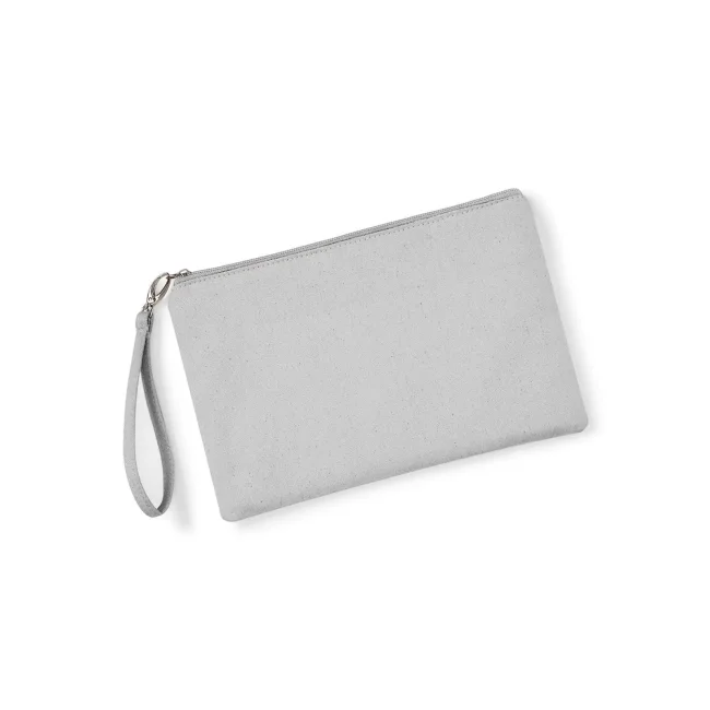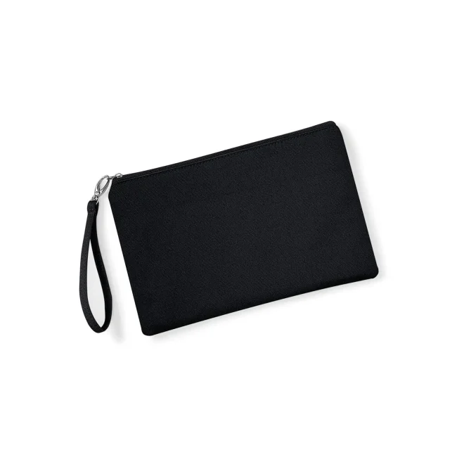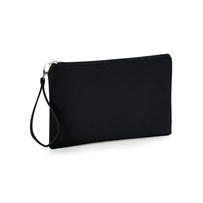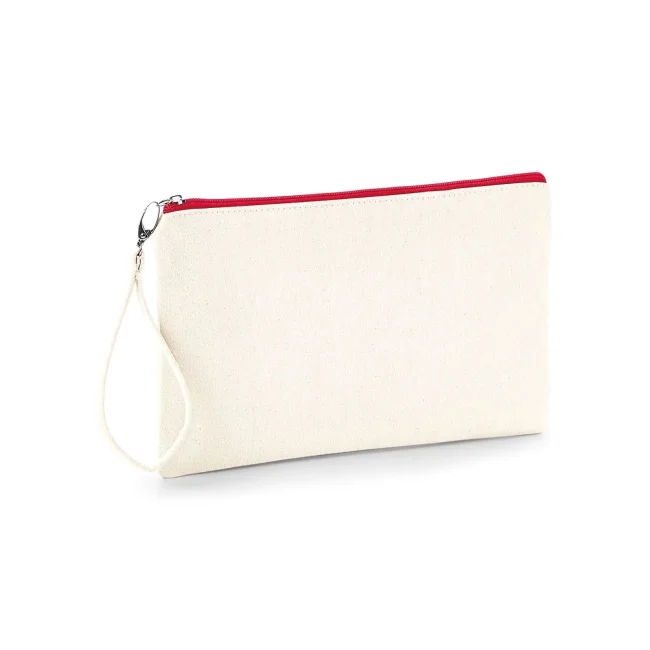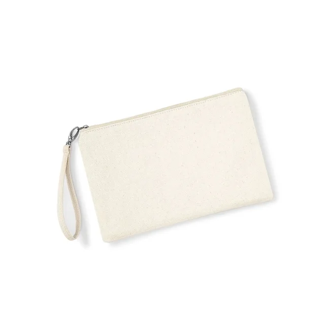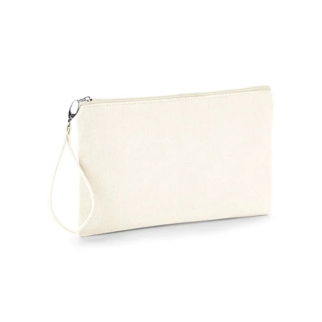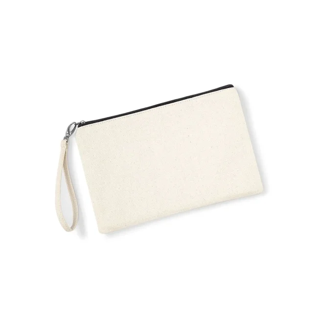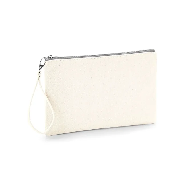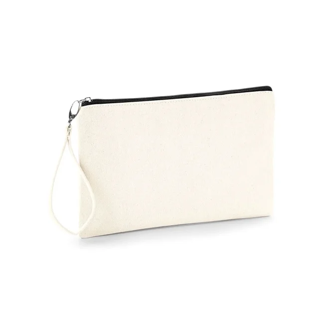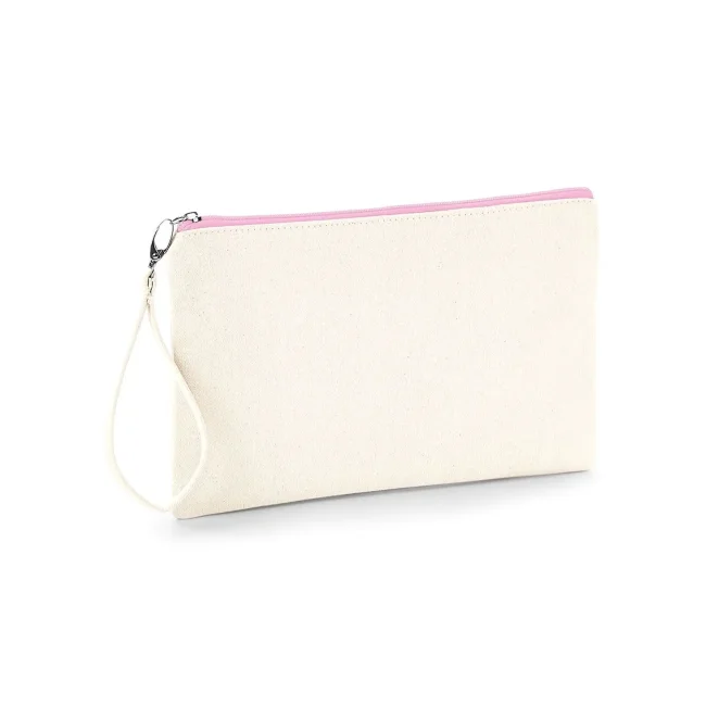 100% cotone Canvas. Pochette multiuso con zip con colore a contrasto, cinturino da polso staccabile, chiusura con zip. Etichetta removibile. Lunghezza manico: 15 cm. Dimensioni: 26x17 cm, capacità: 1 litro, area stampabile: 21x13 cm.