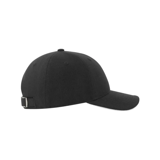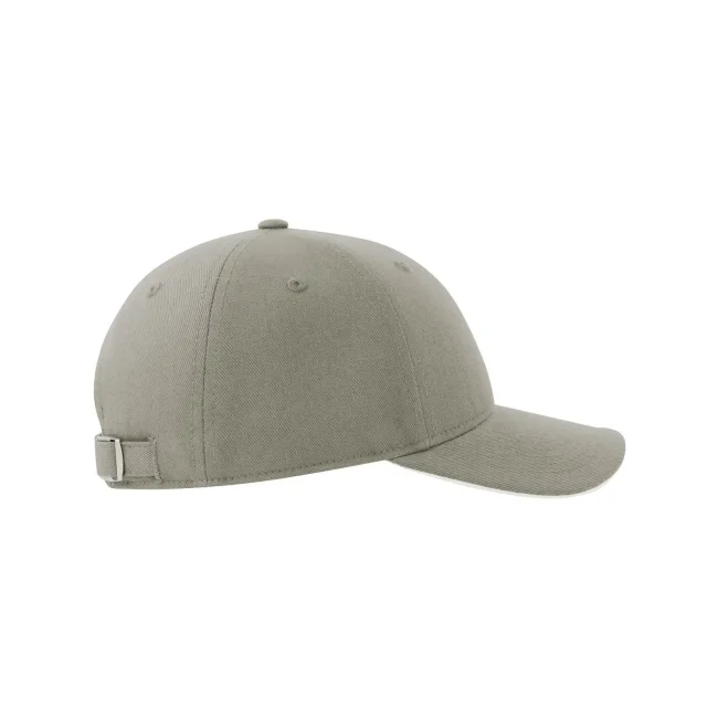 Cappellino Liberty Sandwich-S realizzato in cotone organico twill pesante spazzolato e cotone riciclato, presenta una visiera tipo sandwich con inserto a contrasto. La chiusura con cinturino passante su fibbia in metallo e l'occhiello ricamato completano il design.