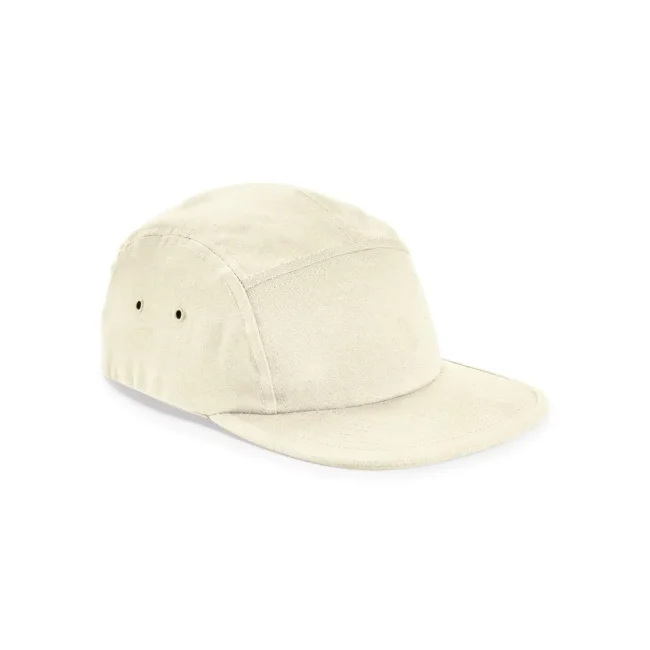 Cappellino Canvas 5 Camper Panel Cap realizzato in 100% cotone canvas. Presenta un design a 5 pannelli con visiera piatta e occhielli in metallo sul lato. La regolazione della taglia avviene tramite fibbia con gancio a scatto, rendendolo pratico e adatto a personalizzazioni aziendali.