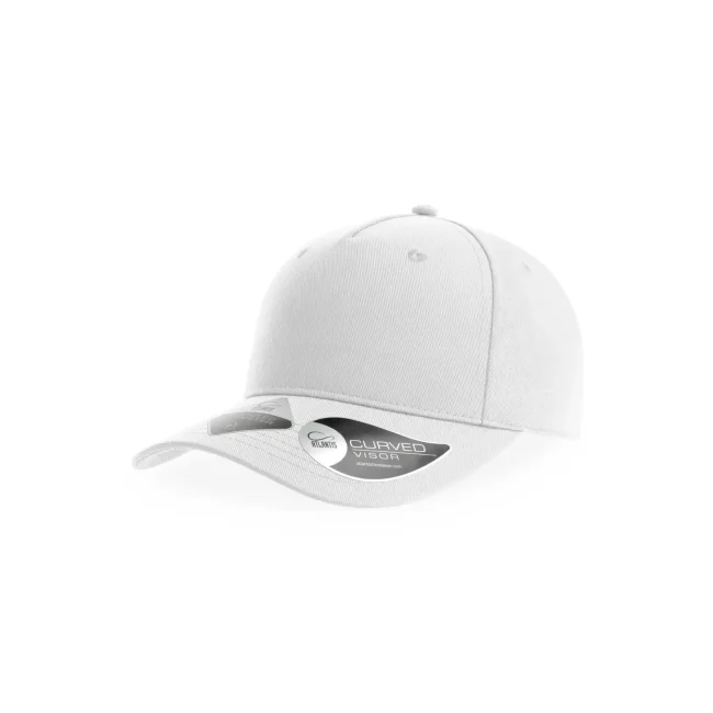 Cappellino Fiji realizzato in 100% poliestere twill riciclato certificato. Presenta una struttura a 5 pannelli con visiera curva e cuciture in tinta. La chiusura a strappo sul retro e l'ampia corona lo rendono ideale per la personalizzazione, perfetto per attività all'aperto.